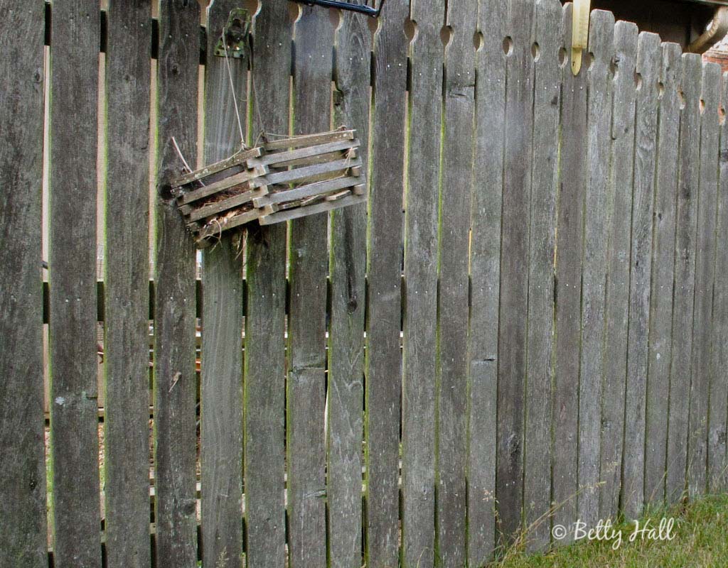 This wooden planter was made by our son about thirty years ago. It’s hanging on the fence near our patio and from a distance it looks empty. However it contains a special surprise.