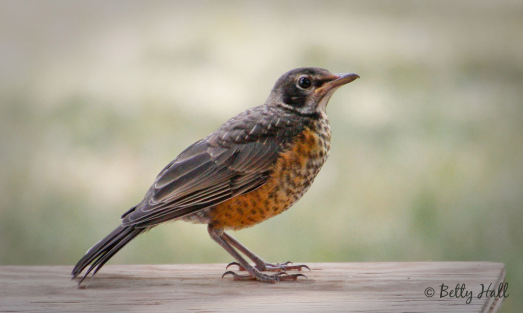 The morning after my “Baby robins” post I saw the young birds, but by afternoon the nest was empty. I was surprised at how much I missed them and wondered if something had gone wrong. However, in a few days a young robin that would have been about the right age appeared in the backyard. It was frequently begging for food and being fed by an adult male.