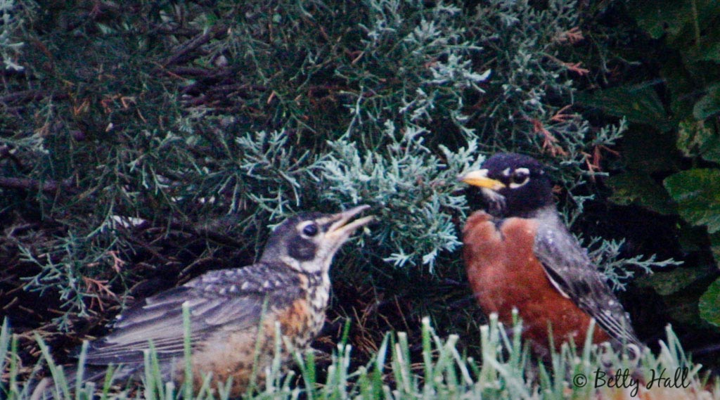 It’s been fun watching the interaction between the two. “Dad” gradually distanced himself from the “I’m hungry and want food now” cheeps and let the young robin begin to fend for itself. We frequently see the young one in the backyard. It’s now finding its own food, has grown considerably, and is no longer a “baby robin.”