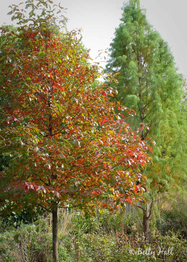 The leaves of our Black Gum (Nyssa sylvatica) also known as Black Tupelo, and the Bald Cypress (Taxodium distichum) are signaling a change of seasons.