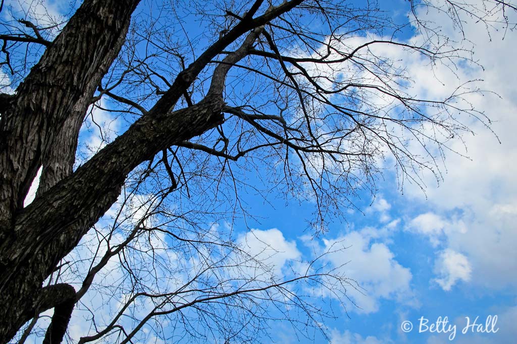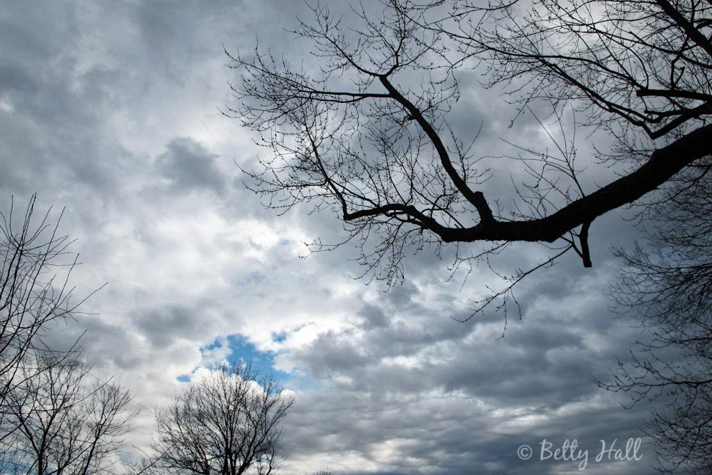 When I looked to the west I saw dark, fast-moving clouds. To the east, the sky was entirely different with lots of bright blue sky and white fluffy clouds. In both scenes I appreciated the contrasting tree branches.